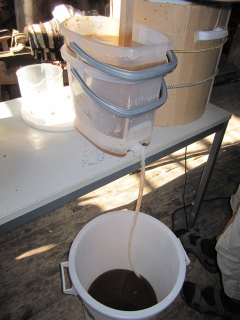 Die heiße Maische wird nun grob gefiltert, um die Spelzen und